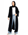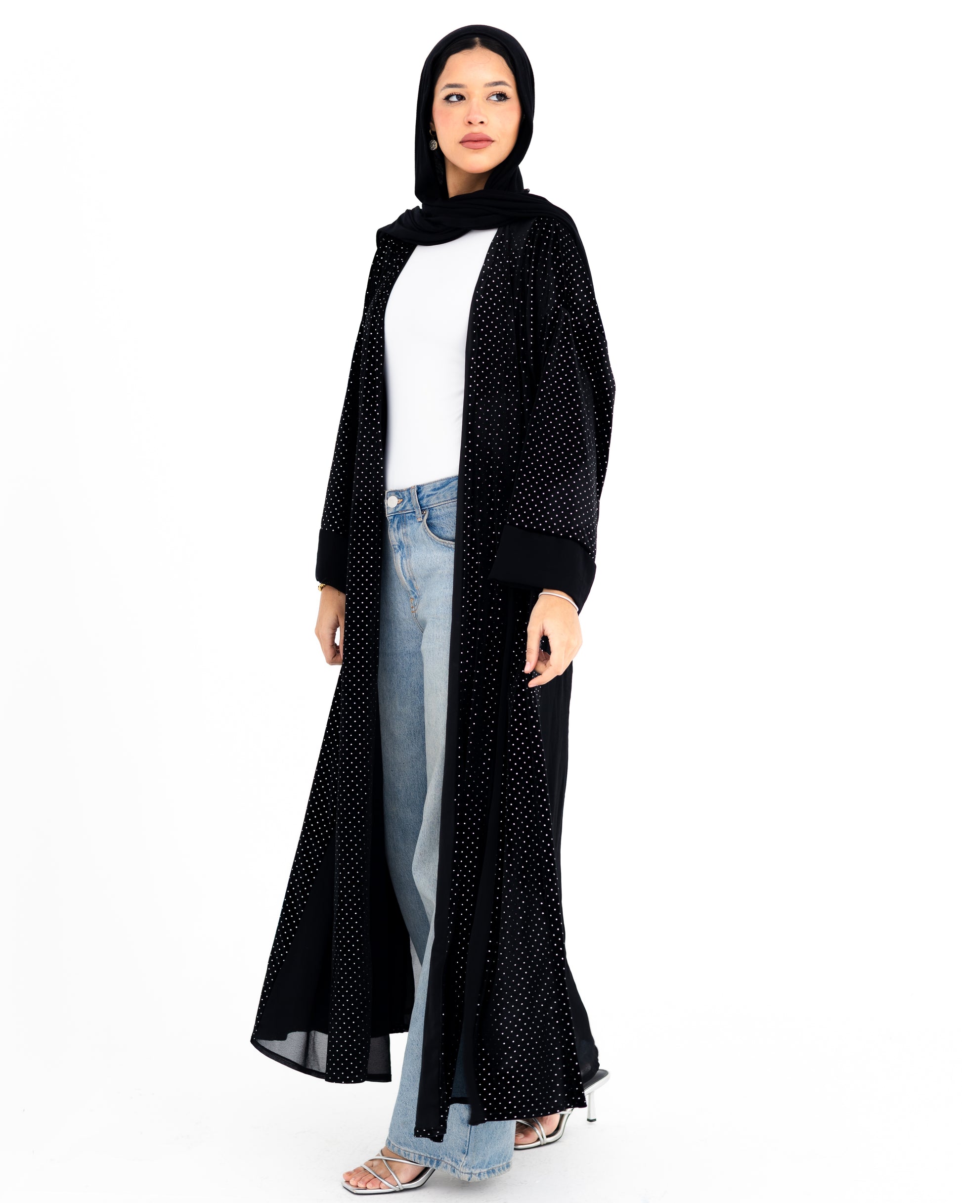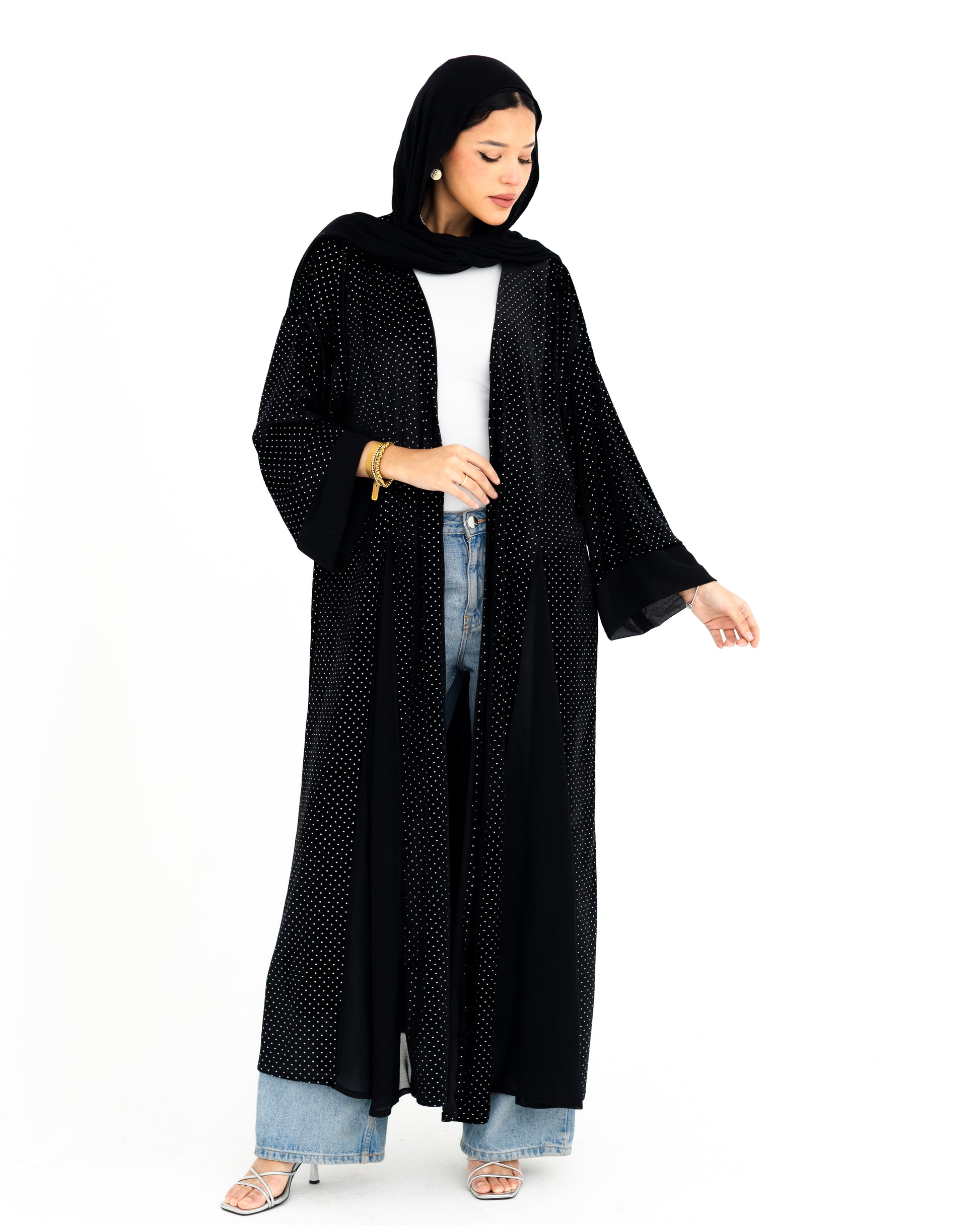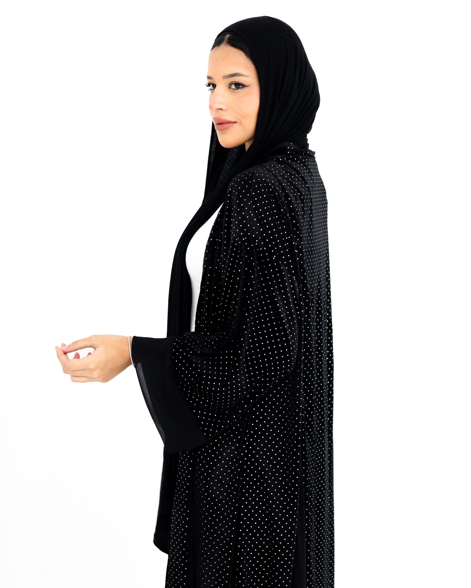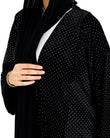 An elegant lightweight kaftan crafted from delicate sheer fabric with a subtle dotted texture. Designed with a flowing silhouette and scarf detail, it adds effortless sophistication when layered over casual or dressy outfits.