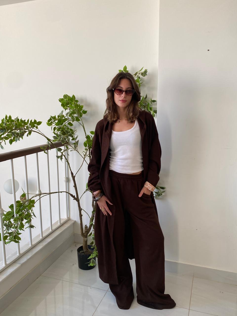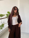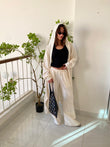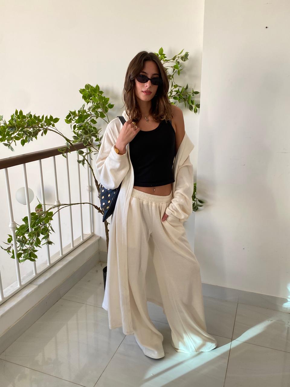 Say hello to your new soft-girl essential. This cozy cream set features wide-leg pants and a relaxed hooded cardigan that gives you that effortless “off-duty but still cute” look. Made from warm, plush Melton fabric, it’s perfect for coffee runs, chill days, or layering up in style. Lightweight, flowy, and insanely comfy—this set blends a laid-back vibe with a feminine touch, making it a must-have for your everyday wardrobe.