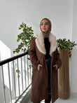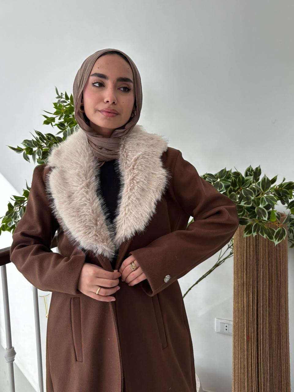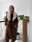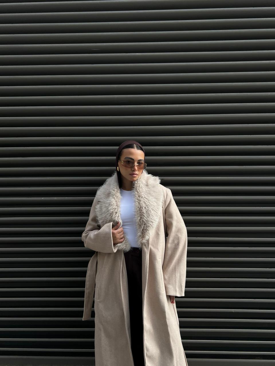 This elegant long coat is designed to make a statement while keeping you warm and polished. Featuring a sleek silhouette with a soft fur-trimmed collar, it adds a touch of luxury to any winter look.