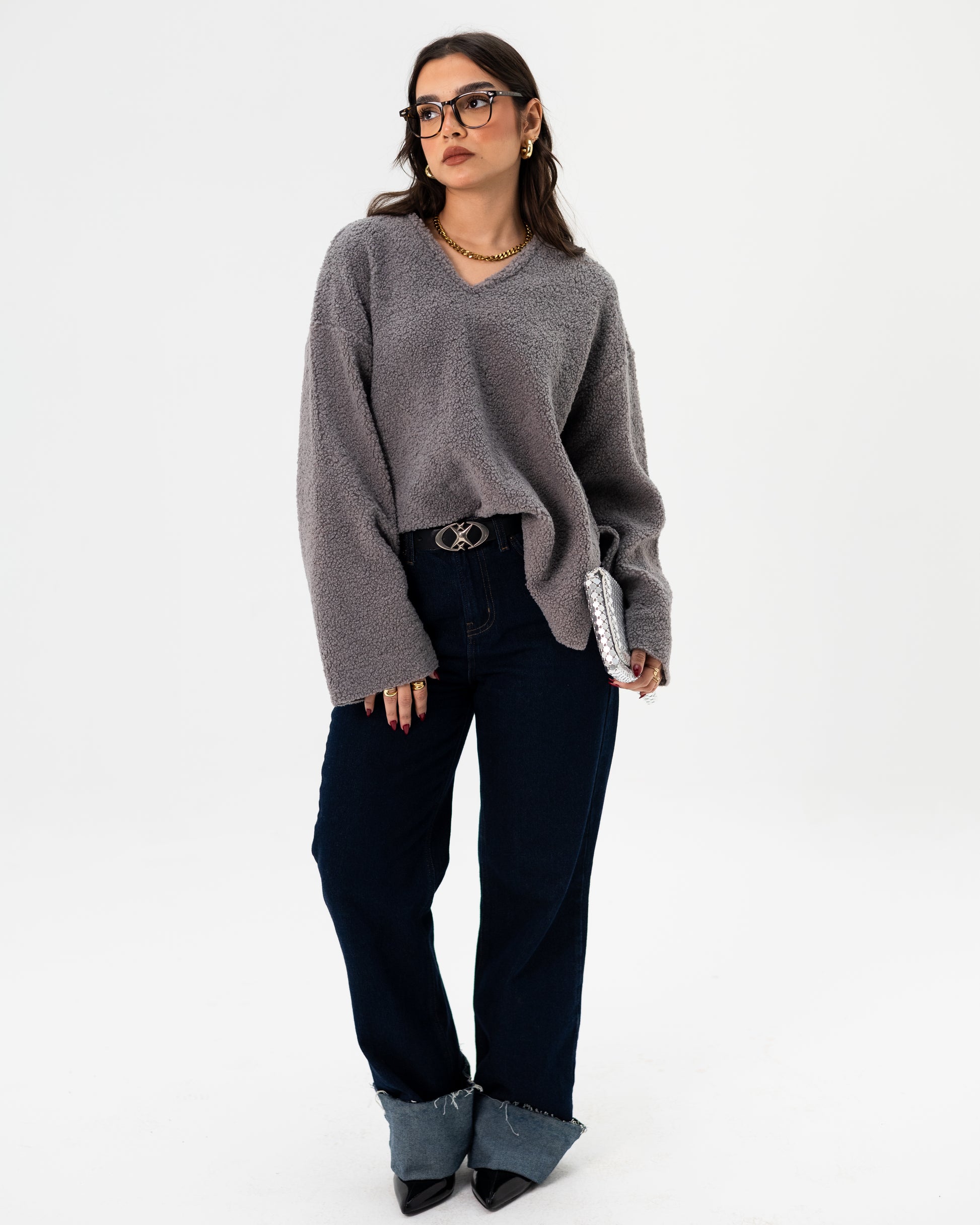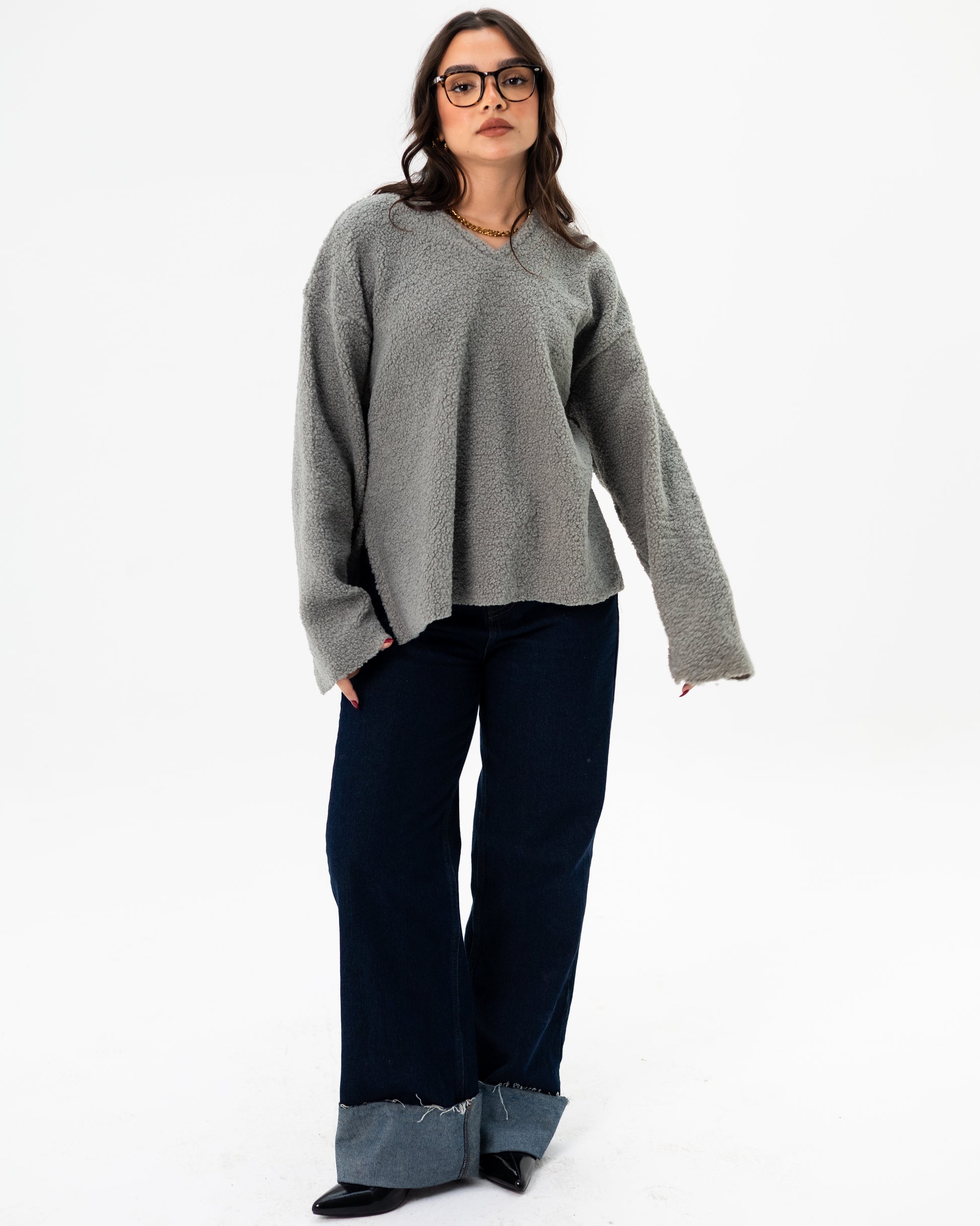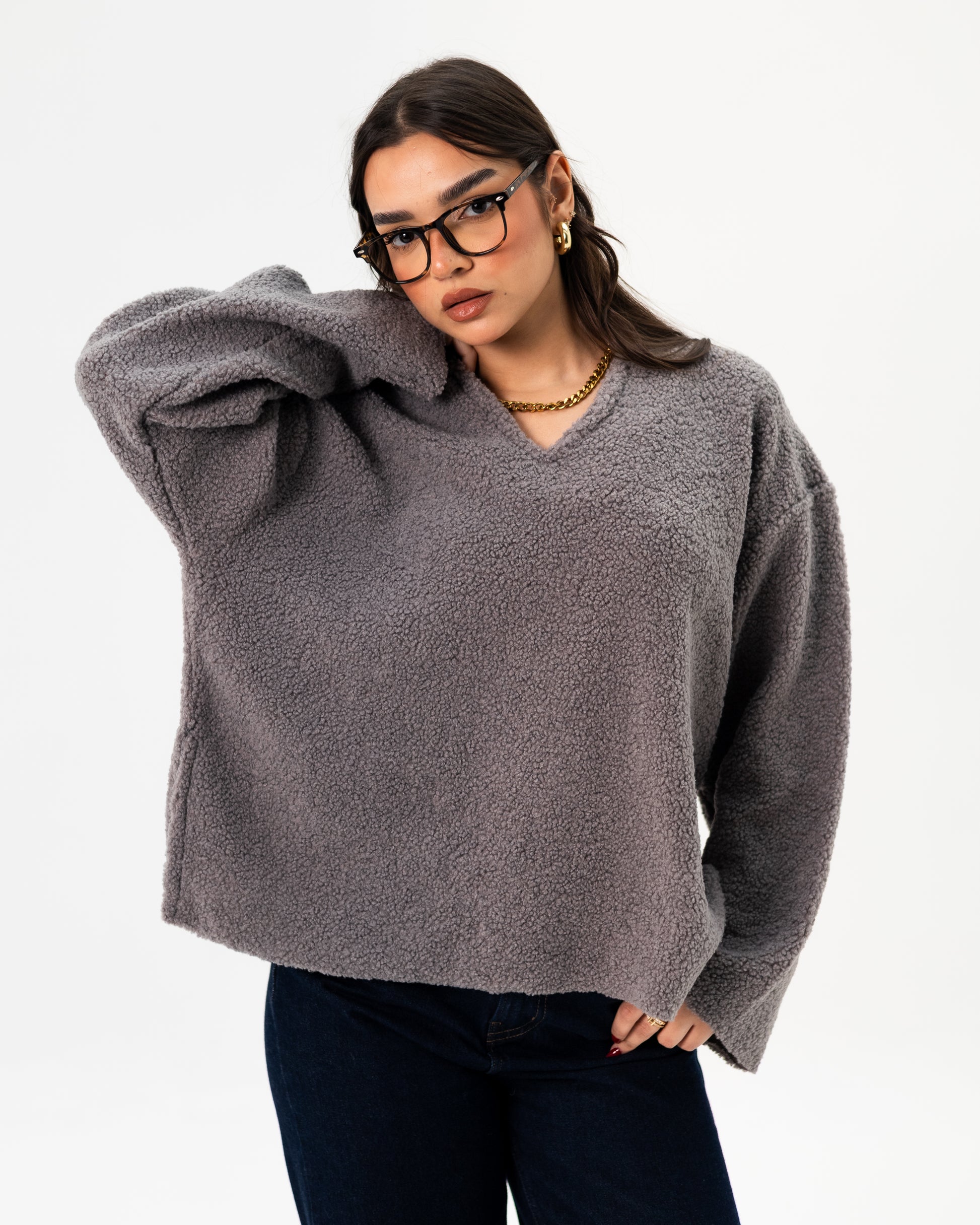 A soft, teddy-textured pullover designed for effortless comfort and everyday warmth. Made from a plush, cozy fabric with a relaxed fit and a flattering V-neckline—perfect for layering or wearing on its own. Its lightweight feel keeps you warm without feeling bulky, making it an essential go-to for chilly days.