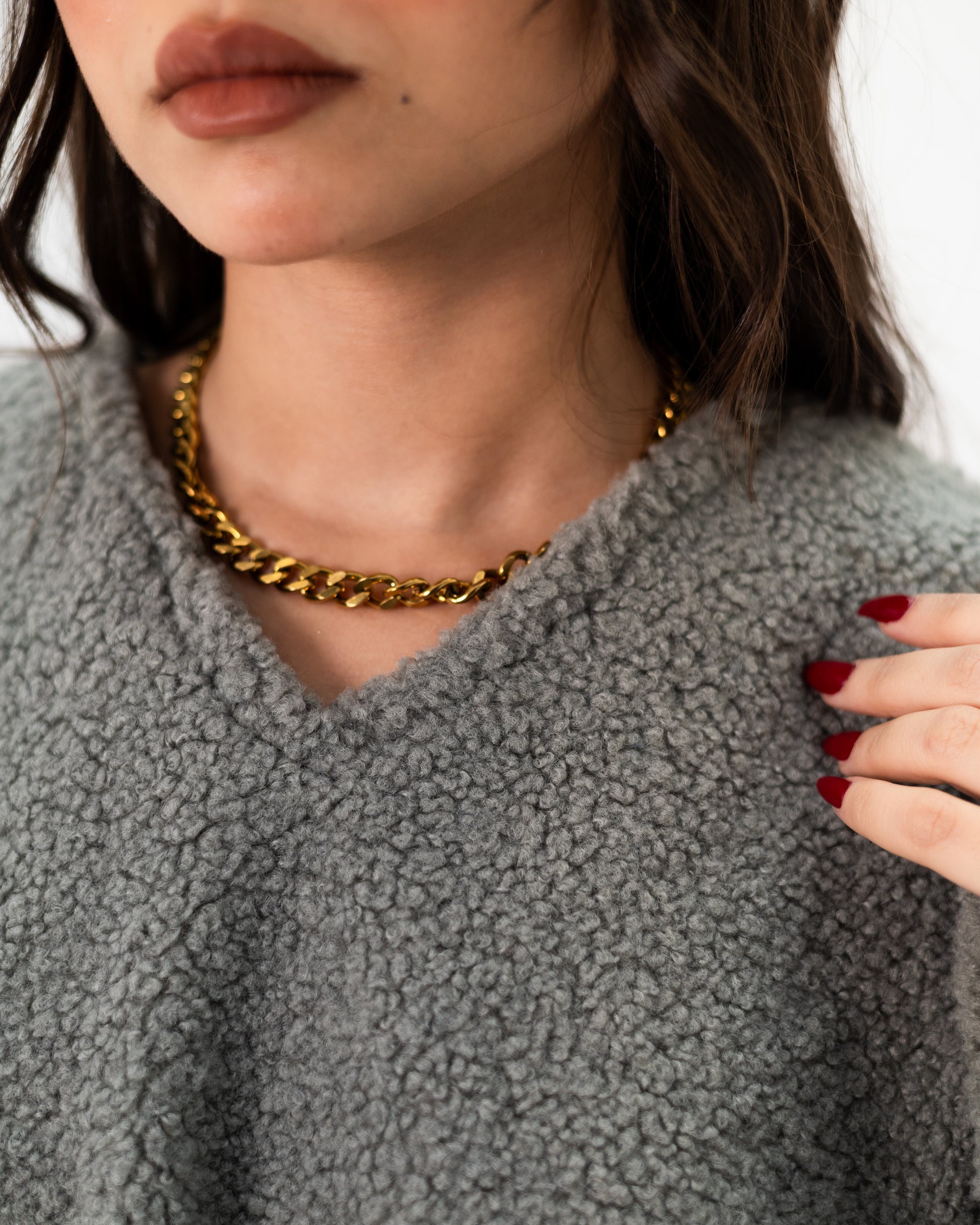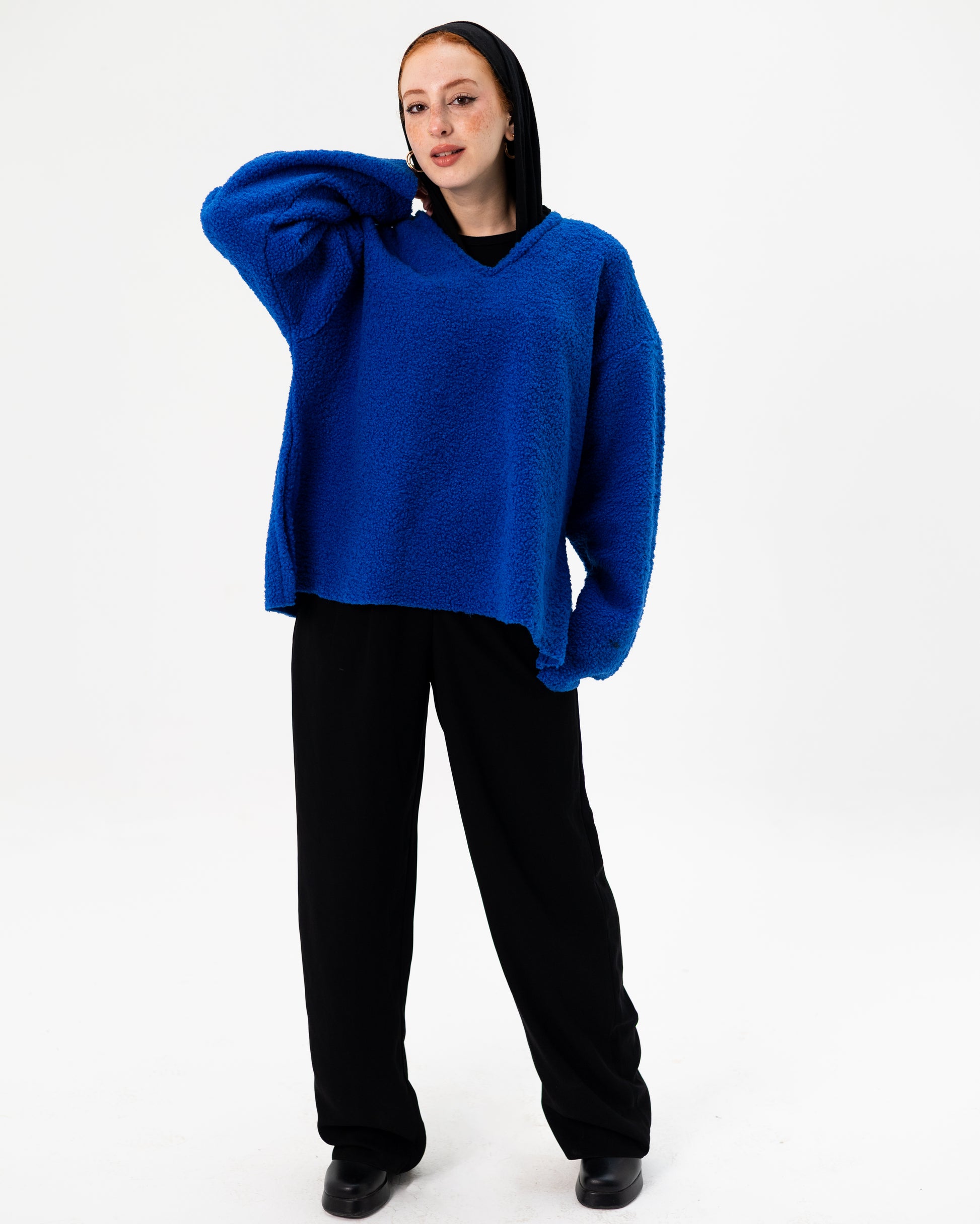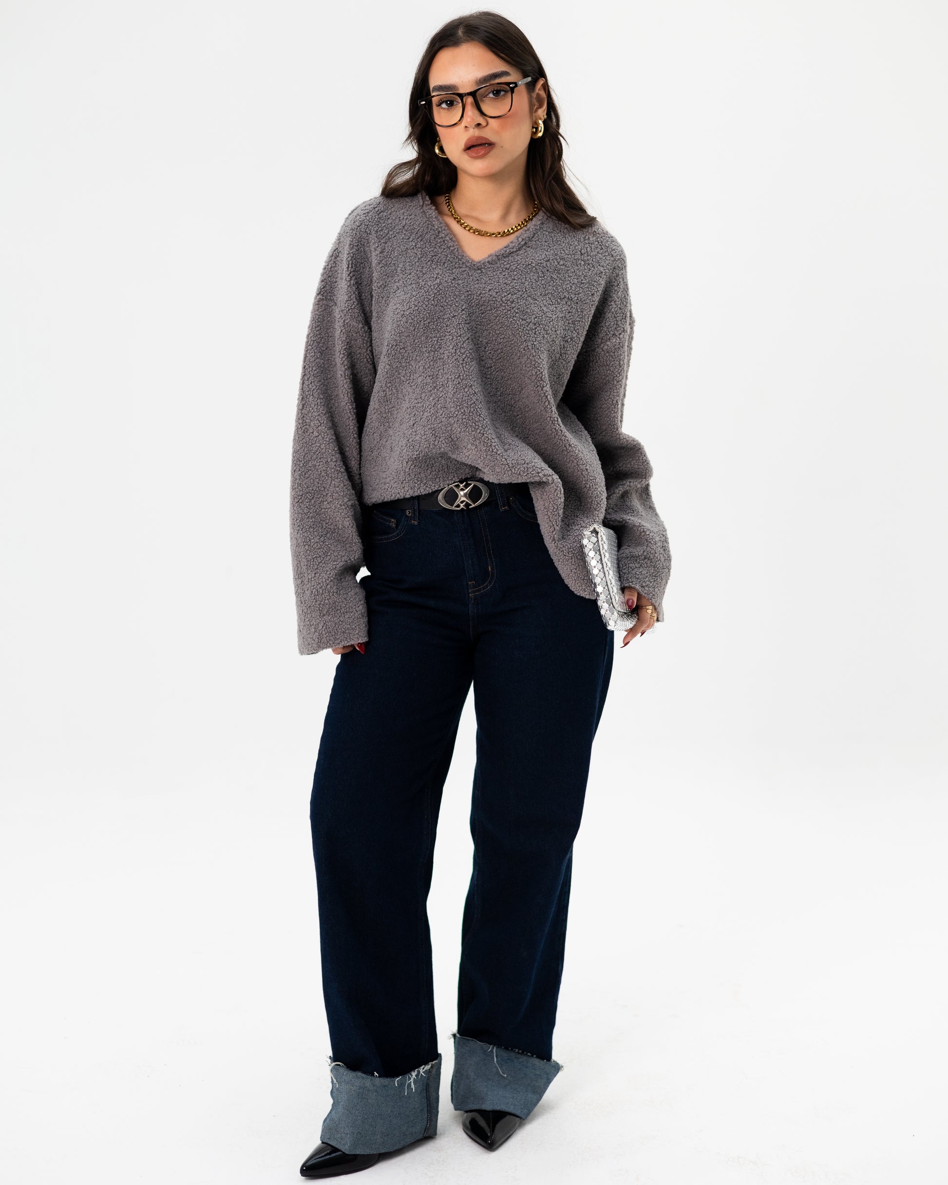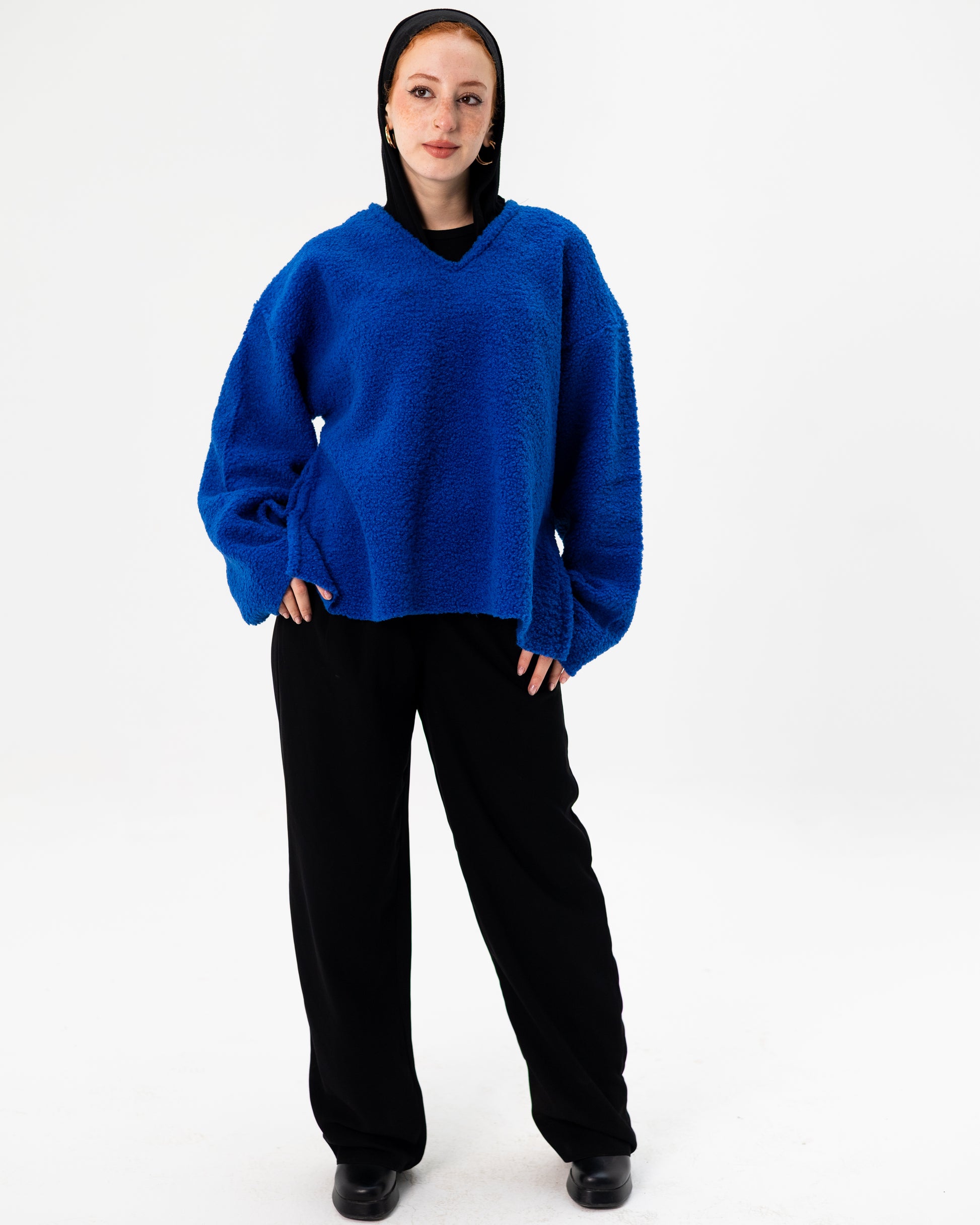 A soft, teddy-textured pullover designed for effortless comfort and everyday warmth. Made from a plush, cozy fabric with a relaxed fit and a flattering V-neckline—perfect for layering or wearing on its own. Its lightweight feel keeps you warm without feeling bulky, making it an essential go-to for chilly days.