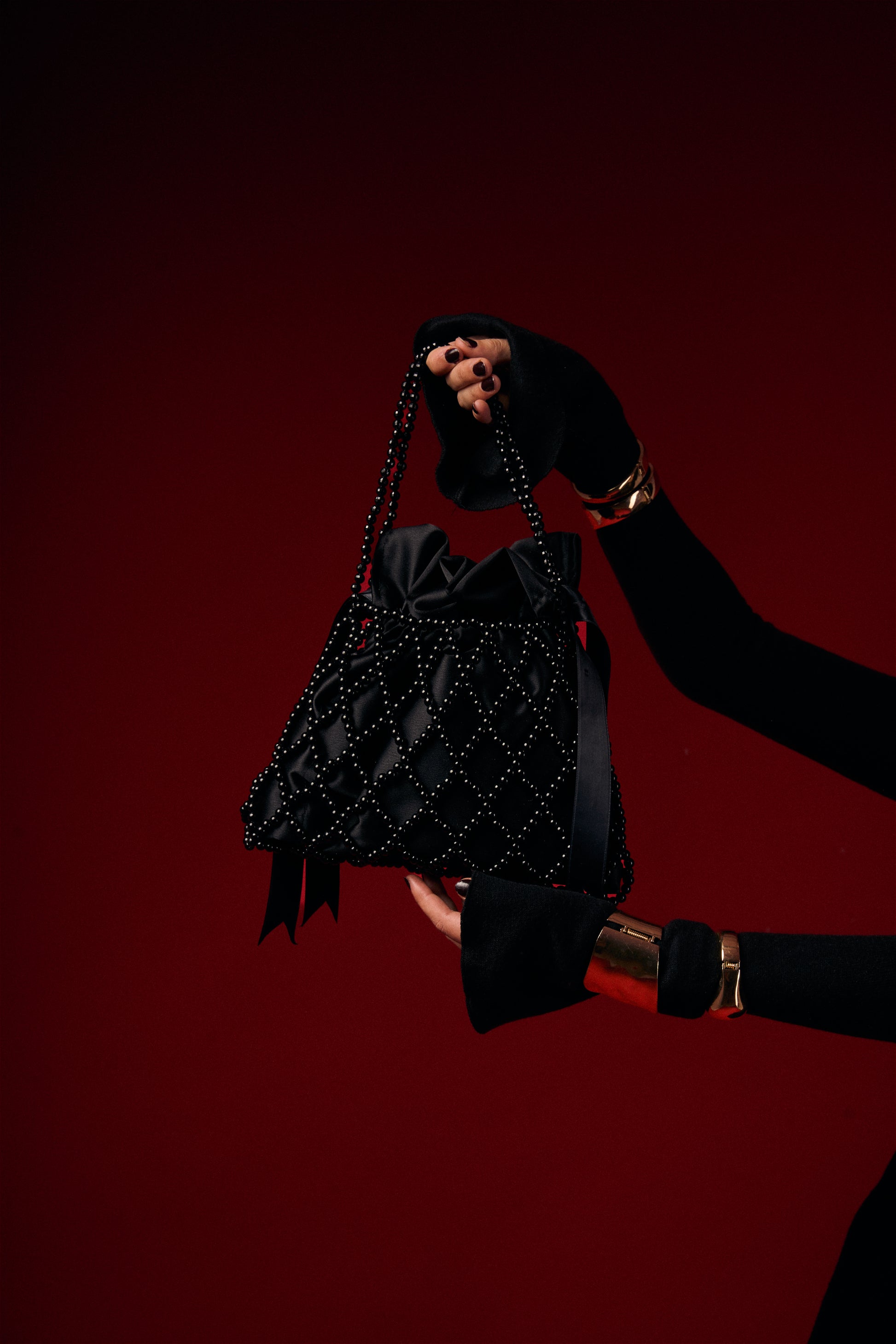 The Noir Royale Bag is a statement evening piece crafted with glossy black beads in an intricate diamond pattern. Designed to elevate any outfit, it features a soft inner pouch with a drawstring closure to keep your essentials secure. Compact yet eye-catching, it’s the perfect accessory for dinners, events, and nights out.