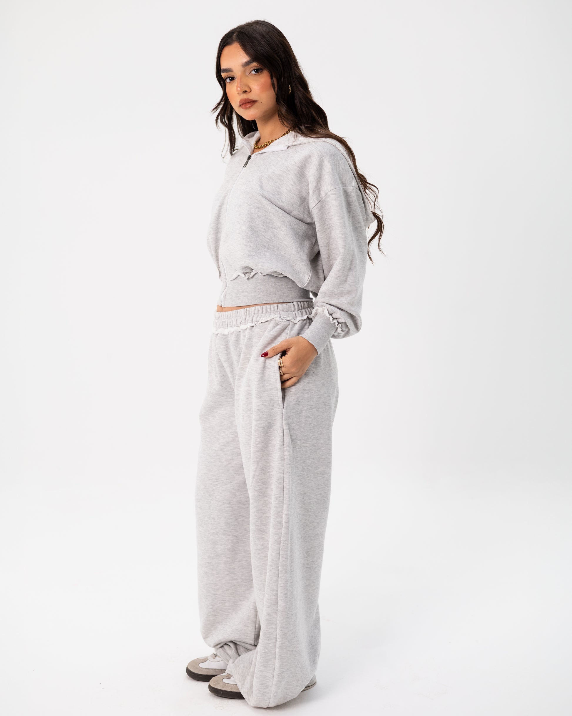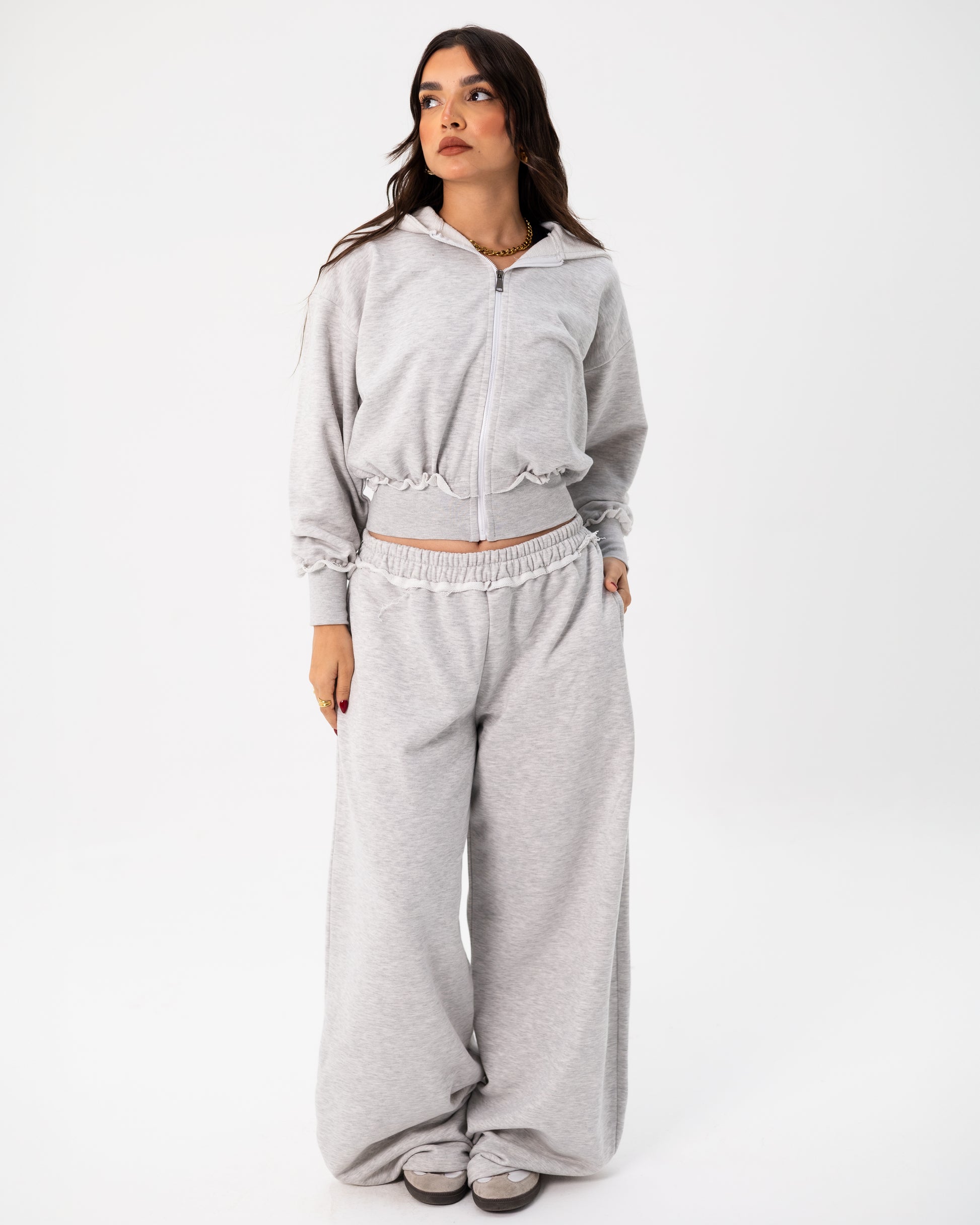 Soft, warm, and effortlessly chic, this matching zip-up and wide-leg combo is made from premium Melton fabric that gives you structure with comfort. The cropped jacket adds a modern twist, while the high-waisted pants with ruffled detailing give the perfect flattering fit. Ideal for cozy days, casual outings, or a put-together everyday look.